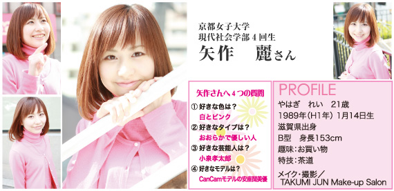 まるで絵本の世界から飛び出してきたような印象の矢作さんは、とても穏やかな笑顔でインタビューに応じてくれました。大好きな色だというピンク色の服がとっても似合う女の子らしい彼女ですが、厳しい茶道部を三年間続けてきたというしっかりとした一面も持ち合わせています。京都女子大学のミスコンである「京女やまとなでしこ選手権」に出場したのも人見知りの自分を打開したかったことが理由だそう。時折考えながらも、ゆっくりと言葉を重ねる姿はとても誠実で落ち着いた印象を受けました。 残り一年間となった大学生活は「新たなことに挑んでみたい」と強く語ってくださいました。今後も彼女らしく輝き続けてほしいです!