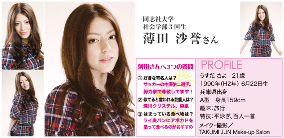 人を惹き付けるような大きな目、鼻筋の通った綺麗な鼻。そんな美しい、きりっとした顔立ちを持つ薄田さん。高校生の時にスカウトされ、それ以来学業とモデルの仕事をうまくこなしているという彼女。クールな印象とは裏腹に、インタビューでは明るい笑顔で質問に答えてくれた。そして、時にはインタビュー経験が浅い私たちに気をつかい、逆に質問を投げかけてくれるという優しさも見せてくれた。