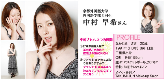 「大人っぽくて落ち着いた女性」それが今回の花のキャンパス中村さんと対面した時の印象だ。大学ではバスケや写真サークルなどに所属しているという中村さん。特にバスケは小学生のころから続け、現在も地元の三重で大会がある時には必ず帰って参加しているそうだ。そんな彼女のマイブームは「アルバム作り」。高校、大学の写真をコラージュして作り、これからもどんどん増やしていきたいとのこと。将来の目標は「企画の仕事に携わり、たくさんの人を笑顔にしたい」と語ってくれた。これからもその目標に向かって邁進してほしい。