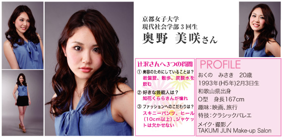撮影を終え颯爽と現れた彼女の第一印象は、とても同年代とは思えない「大人の女性」。しかし時折見せる無邪気な笑顔にとても愛らしいギャップを感じた。そんな彼女は海外で撮影をしたこともあるほどモデルとして実に経験豊かである。普段からメイクや美容、ファッションに気をつかい、ヒールは10センチ以上のものしか履かないというこだわりもあるそうだ。