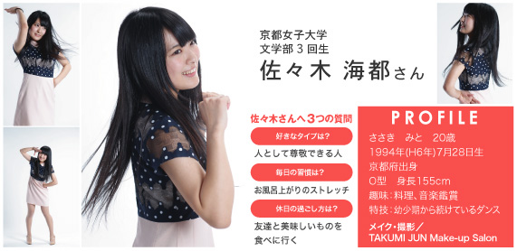 幼少期から続けているダンスのスキルを活かし、現在は京都女子大学公認のアイドルコピーダンスサークル『Cotton Candy』のサブリーダーとして活躍している。ダンスは自分の納得のいくまで練習を欠かさず、踊っている時の表情にまでこだわる徹底ぶり。一方で将来の夢は英文科ということもあり、国籍を超えて多くの人に「ありがとう」と言われるような仕事に就くこと。その夢を叶えるため、ダンスの傍ら英語の勉強にも熱を注いでいるのだそう。そんなアクティブで真っ直ぐな、彼女の今後の活躍に期待したい。