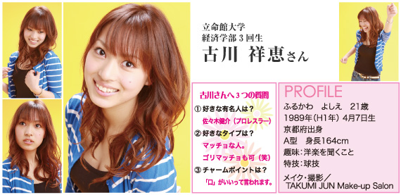 太陽のように明るい笑顔を見せてくれた古川さん。インタビュー中の元気な笑い声が印象的でした! 「暇は苦手」と話す彼女は、サークル活動やアルバイトなど多くのことをバランスよく行い、充実した大学生活を送っているようです。サークル活動では、野球サークルのマネージャーとして元気いっぱいに選手を応援するだけでなく、キャッチボールに参加するというアクティブさの持ち主。笑顔が可愛く、コロコロ変わる表情から目が離せませんでした! 「毎日が楽しい!」そんな雰囲気の溢れる彼女の周りは、今日も笑顔で満ちていることでしょう。