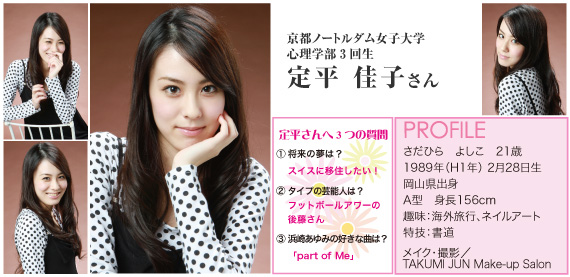 また、彼女は完璧主義だという。話の中でも、美容・ファッションなど細かく気をつかう姿勢が伺えた。彼女の持つ洗練された雰囲気は、そのようなきめ細やかな配慮によるものなのだろう。そんな彼女の2011年の目標は「大学生活最後の年を満喫すること」。定平さんの一年は、彼女自身のように光り輝くものとなるに違いない。