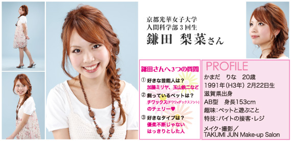 キラキラした笑顔が可愛らしい鎌田さん。インタビューでは彼女のキュートな魅力を知ることができました。栄養学を専攻し、将来管理栄養士になるため日々勉強に励む彼女は、学業と2つのバイトを両立させるパワフルな女性。また、とても家族想いで「尊敬する人はお母さん。家事と仕事を両立させる大変さを今になってよく分かるようになった」と語ってくれました。