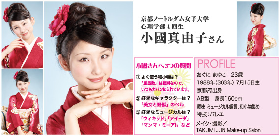 赤色の着物がお似合いの今月の花のキャンパスは「2011京都・ミスきもの」である小國さん。おしとやかな雰囲気を持つ彼女ですが話してみるととても気さくな方で、取材中も様々な話で盛り上がりました。小國さんの趣味は「ミュージカル鑑賞」。ミュージカル音楽も大好きで、特に「『アイーダ』のサントラがお気に入り」と教えてくださいました。また、京都が大好きという彼女に「京都といえば?」と尋ねると「着物が似合う町」という回答が。着物を上手に着こなす小國さんらしい言葉でした。とても魅力的な小國さんの、これからの活躍が楽しみです。