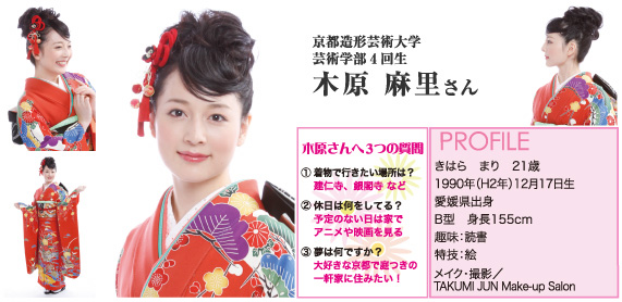 今回の表紙は「京都・ミスきもの」の木原さん。着物に身を包んだ彼女は可愛らしく上品で、まるで女優さんと対面した様だ。着物の魅力を尋ねると、季節感を楽しめる所と、制約があるからこそ、その中で個性が発揮できる所と答えてくれた。また着物を着ることで周りへの思いやりの心をより大切にしたいと考えるようになったという。木原さんは大学でデザインを学んでおり、動画から印刷物まで幅広く制作している。そんな彼女なので着物の着こなしにもセンスが光りそうだ。見た目だけでなく中身も「しゃん」と美しい。同性でも憧れてしまうほど魅力あふれる木原さんを見て、こちらも思わず背筋を伸ばしてしまった。