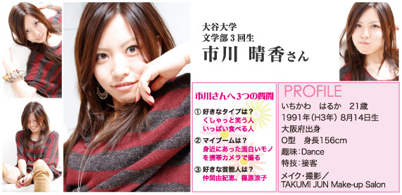 今回の花キャンは大きな瞳が印象的な市川さん。「アクティブな性格」だという彼女は、大学から始めた独学で学んでいるダンスに夢中になっている。そしてその実力を月に一回開かれるイベントで披露しているという。また大の温泉好きであり、時間を見つけては友達と足を運んでのんびり過ごすいうほっこりした一面も、彼女の魅力の一つであろう。「全員が教師」だという彼女の家族に影響を受け、将来の夢として小学校教諭を目指しながら「今後は英会話を勉強して外国の方とコミュニケーションをとれるようになりたい」と目標を語る彼女は、とてもキラキラ輝いて見えた。