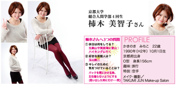 「こんにちは〜」と、撮影を終え取材陣の前に現れた柿木さん。緊張しましたと言いつつさっぱりした笑顔を見せてくれ、明るい印象を受けた。じっくり話をしてみると、なんとまあ軽快な関西弁。話は学園祭のファッションショーの事から趣味だという海外旅行の事まで多岐に渡った。特にファッションショーについては本当に楽しかったんだろうな、と私達がワクワクするくらいキラキラと語ってくれた。休日は登山をしてリフレッシュしているという彼女。現在はアルバイトや卒論、就職先の課題など忙しい日々を送っている。そんな中この取材を「卒業前のビッグイベント」と称してくれて、嬉しくなった。
