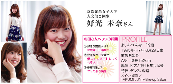 初めての取材に緊張しながらもキュートな笑顔で応えてくれた好光未奈さん。高校からダンスを続けていて、現在はよさこいサークルで日々練習に励んだり、ピアノを15年続けていたりと、何事にも一生懸命な姿に取材をしているこちらまで笑みがこぼれた。